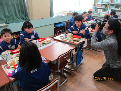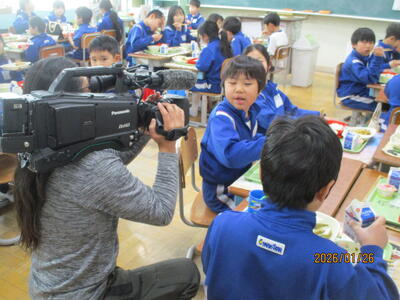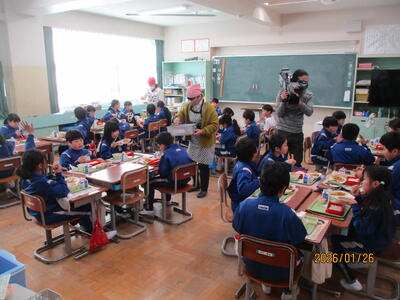 全国学校給食週間に合わせて、町名産の「ホンモロコ」の唐揚げ(のりしお味)が出されました。高級魚と知られる「ホンモロコ」は、適度に塩味が効いて、おかわりをする子供が何人もいました。町のケーブルテレビCTBさんが取材にお見えになり、子供たちが楽しく会食する様子を収録していました。