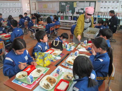 2年生教室の給食の配膳と会食の様子をお知らせします。