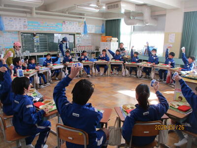4年2組 (2組さんには誕生日の友達がいたので、座席を円形にして会食していました。牛乳で乾杯をして祝っていました。)