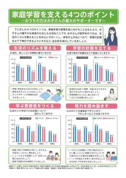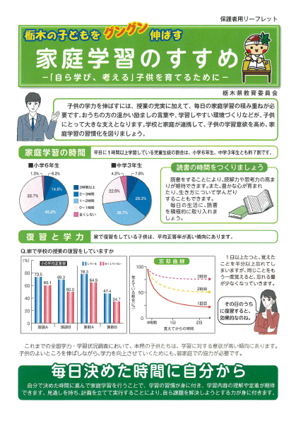 下記に栃木県教育委員会の作成した「家庭学習のすすめ」「家庭学習を支える4つのポイント」を掲載しますので、ぜひ参考になさってください。(詳細にご覧になりたい場合は添付ファイルをお使いください)