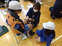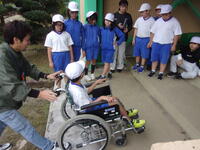 町の福祉協議会の方を招いて、高齢者体験と車いす体験を行いました。