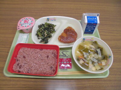 今日の給食には、お赤飯がでています。お赤飯は、日本の伝統的なお祝い料理として、特別な行事のときに食べられてきました。もち米にゆでたあずきなどを加えて蒸して作ります。あずきなどの煮汁によってもち米がほんのり赤く染まり、この色合いから「赤飯」と呼ばれるようになったと言われています。