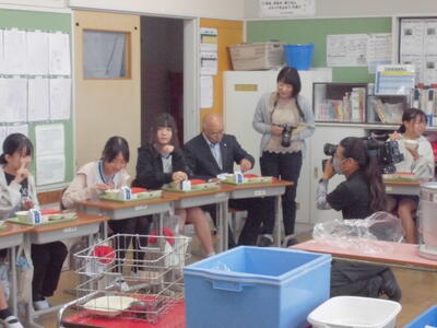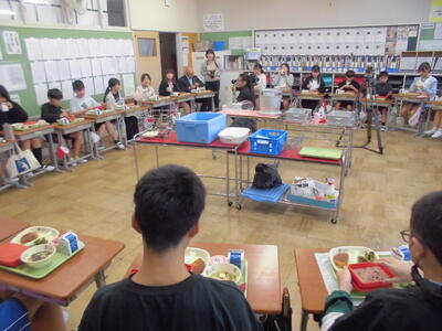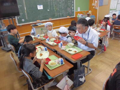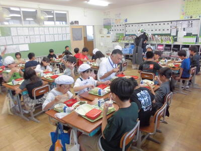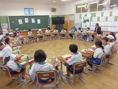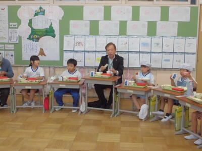 今日の給食には、那珂川町より町長様、教育長様、学校教育課長様が来校し、児童とともに会食しました。