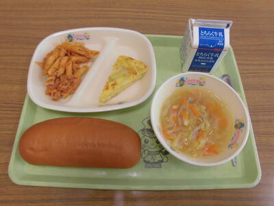 キャラメルパン 牛乳 アンサンブルエッグ ミートソースペンネ 千切り野菜スープ
