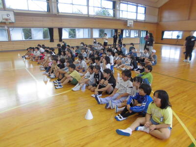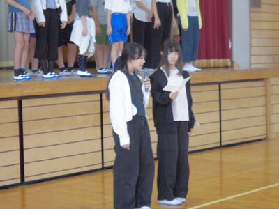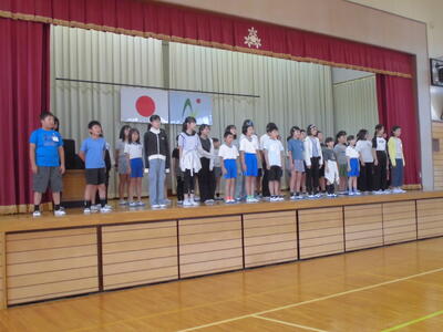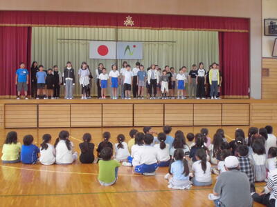 音楽部は10月7日に地区音楽祭に参加します。音楽祭に参加するに当たって、大勢の前で発表する練習として、昼休みに体育館で合唱を披露しました。昼休みにもかかわらず、たくさんの児童が聴きに来ました。