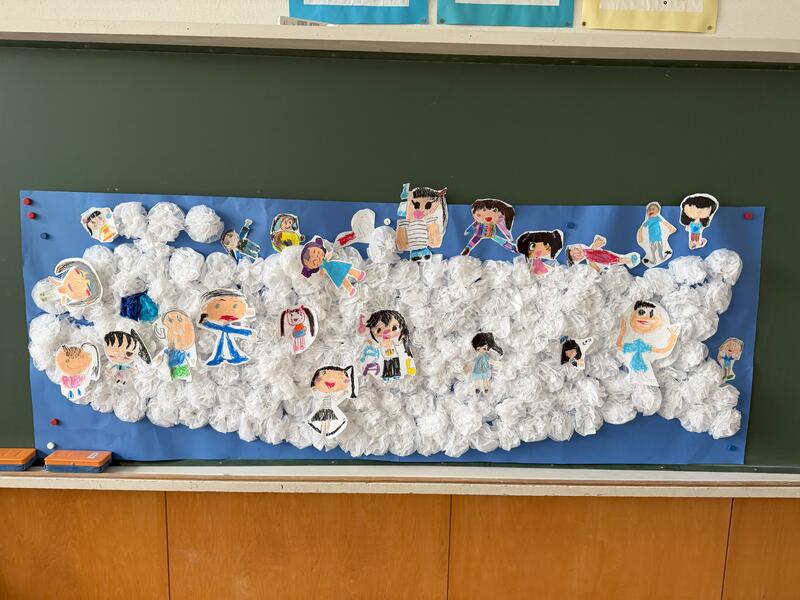 1年生一人一人が自分の似顔絵を描いて、お花紙でつくった「くじらぐも」に乗せていきました。「くじらぐも」の上はとても楽しそうです。