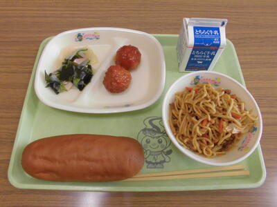 黒糖パン 牛乳 肉団子トマトソース こんにゃくサラダ 焼きそば