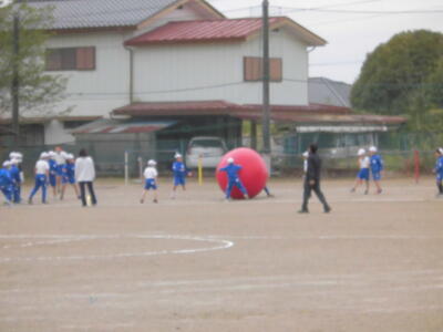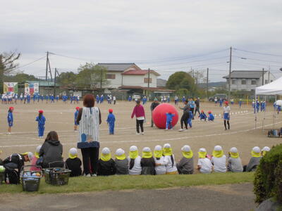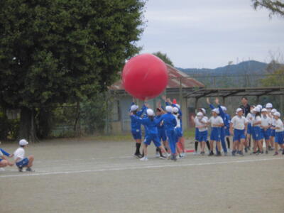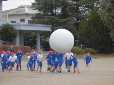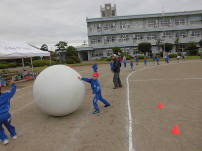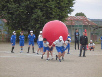 1・2年生は大玉を転がして次の学年に運び、3~6年生は大玉を持ち上げて運びます。