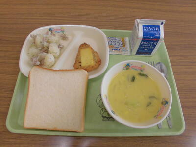 食パン みかんジャム 牛乳 チキンチーズ焼き ジャーマンポテト 粒コーンスープ
