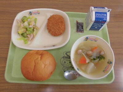 コロッケパン(ミルク丸パン・豚肉コロッケ・中濃ソース) 牛乳 ハムサラダ 野菜のポトフ