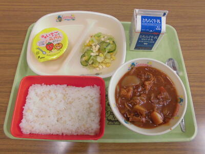 麦ごはん 牛乳 ハヤシシチュー チーズサラダ いちごとみかんのゼリー