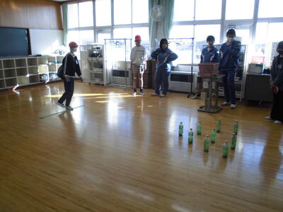 小学5年生から中学3年生までの縦割り班で校内を回り、ジェスチャークイズやボウリングなどのミニゲームを行いました。