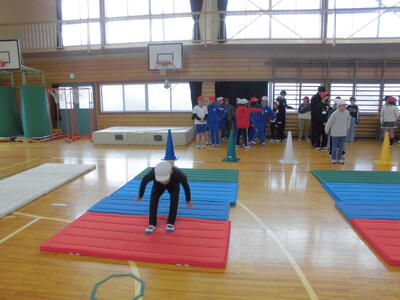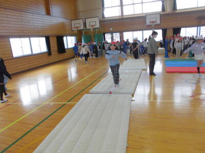 マット上で立ち幅跳びをして、ケンケンパ。