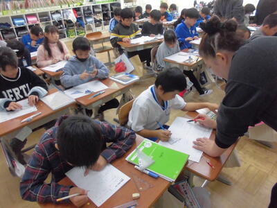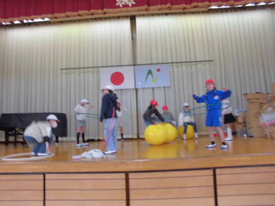 5校時、4年生は小川体育館で親子でボッチャを行いました。