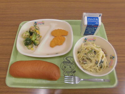 キャラメルパン 牛乳 チキンナゲット ブロッコリーとツナの和え物 クリームスパゲティ
