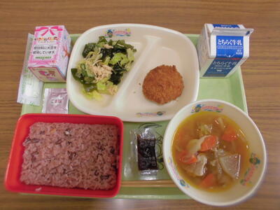 赤飯・ごま塩 牛乳 メンチカツ・中濃ソース わかめサラダ 豚汁 お祝いケーキ