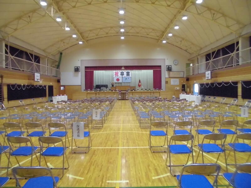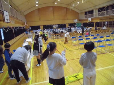 明日は卒業式です。5校時に4・5年生が体育館の会場設営や6年生教室、廊下等の掃除を行いました。