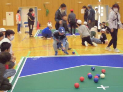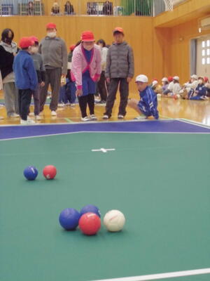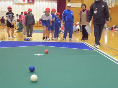 南那須地区内の他の小学校とボッチャで交流をしました。白い目標球に近くなるように集中してボールを投げ、得点を競います。