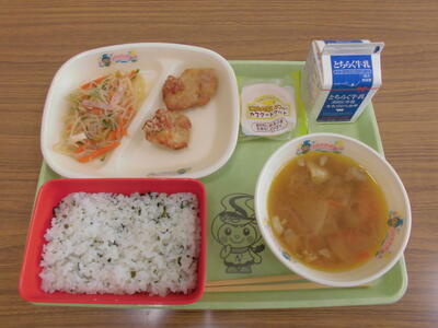 わかめごはん 牛乳 鶏のから揚げ 春雨サラダ 豚汁 レモンタルト