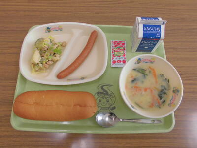ホットドック(コッペパン・ウインナー・ケチャップ)牛乳 ビーンズサラダ
