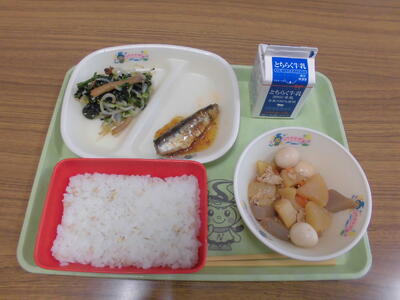 麦ごはん 牛乳 いわしのおかか煮 きのこ入りおひたし 豚肉と大根の煮物
