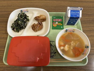 ごはん・のりたまご 牛乳 鶏のから揚げ のり酢和え のっぺい汁