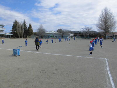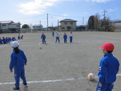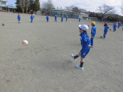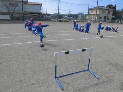 ボールの蹴り方や止め方等、基本的な練習をした後、ゲーム的な要素を取り入れてしっかり蹴る練習をしました。