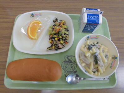 はちみつパン 牛乳 マカロニクリーム煮 ひじきのサラダ カットオレンジ