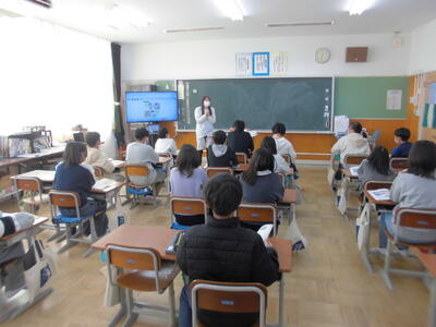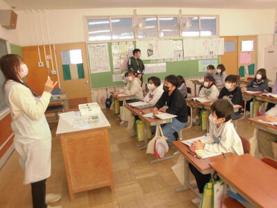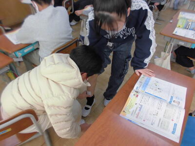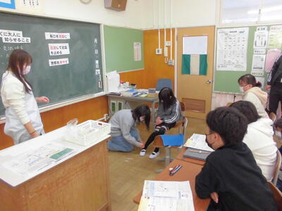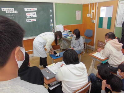 5年1組では、養護教諭による「けがの手当て」の学習を行いました。