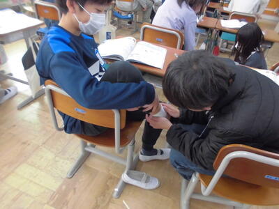 授業の後半では2人ペアになって、「友達が足首を捻挫した」という想定で、どのように湿布を貼ったらよいのか実践しました。