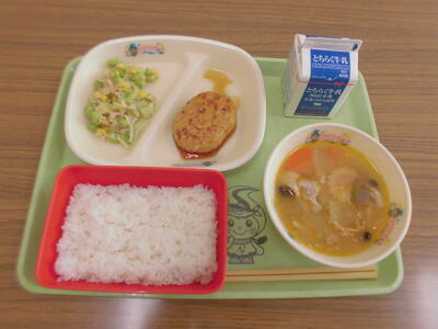 ごはん 牛乳 豆腐ハンバーグ照焼ソースかけ 切干大根のサラダ 巻狩汁