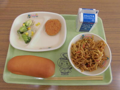 アップルパン 牛乳 野菜かき揚げ バンバンジーサラダ 煮込みうどん