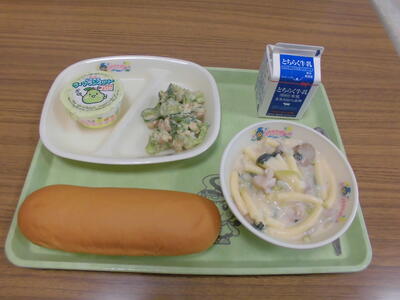 はちみつパン 牛乳 マカロニグラタン 大豆とブロッコリーのサラダ ラ・フランスゼリー