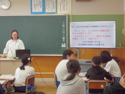 町の保健師や管理栄養士の方が来校し、小児生活習慣病予防に関する授業をしていただきました。