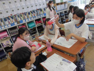 ペットボトルにサラサラの血液とドロドロの血液を模したものが入っており、比較をしました。