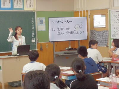 今日の授業では、主に睡眠時間やおやつのとり方についてのお話をいただきました。お話から、小学生の睡眠時間は9~12時間が望ましいこと、おやつは200kcal以内がよいこと等を学びました。