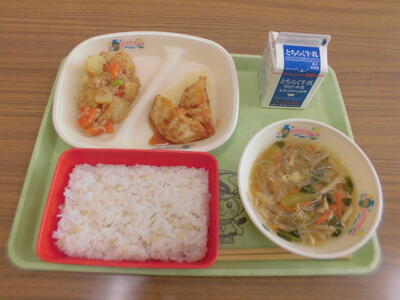 麦ごはん 牛乳 餃子の甘酢あんかけ じゃがいもそぼろ煮 春雨スープ