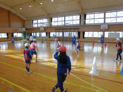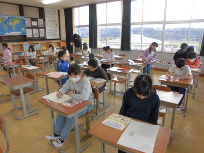 シェイクアウト訓練は、地震発生時に「まず低く、頭を守り、動かない」の3つの安全行動を、その場で約1分間行う訓連です。児童は、地震発生の放送が入ると素早く机の下等に隠れ頭を守りました。