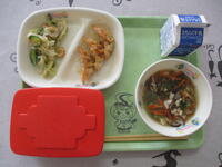 コッペパン いちごミックスジャム 牛乳 野菜のかき揚げ                      キャベツのツナマスタード和え 煮込み