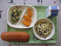 キャラメルパン 牛乳 チキンナゲット ブロッコリーとツナの和え物 クリームスパゲティ