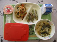 ごはん 牛乳 ほんもろこのから揚げ(のり塩) 切干大根の炒め煮 ゆばの味噌汁 りんごゼリー
