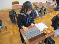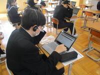 3年生は、全国学力学習状況調査「英語」(話すこと)に取り組んでいます。タブレット(ヘッドホン付き)を活用し、英語の質問に対して、実際に英語を使って答えました。
