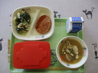 コッペパン ブルーベリージャム 牛乳 鶏肉香味焼き                          ほうれん草のサラダ クリームシチュー