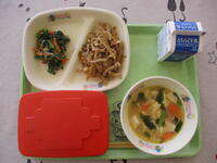 今日から給食もスタートです。和風スパゲティに入っている小松菜には、免疫力を高めるカロテンやビタミンCが豊富に含まれています。