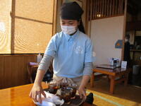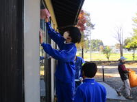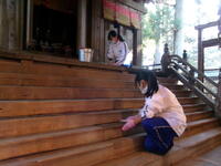 鷲子山上神社では、きれいな紅葉の中、2名の生徒が活動していました。巫女装束の服装で、神社のスタッフと一緒に作業を進めていました。