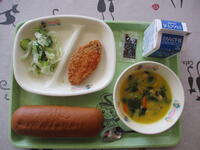 黒糖パン 牛乳 ヤシオマスフライ・中濃ソース グリーンサラダ 豆とかぼちゃのクリームスープ