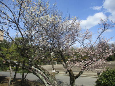 B棟昇降口前の梅の花が満開を過ぎ、散り始めています。