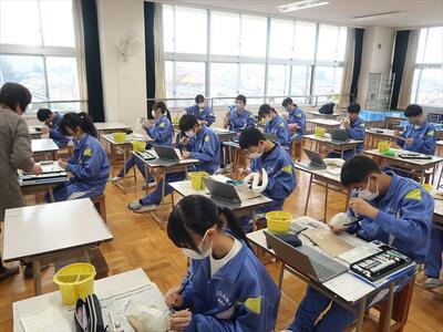 3年生理科は、地球分野の学習をしています。今日は、太陽の動きの観察をしています。同じ時間間隔で太陽の位置を透明半球上にプロットしていきます。正確に丁寧に行っていました。