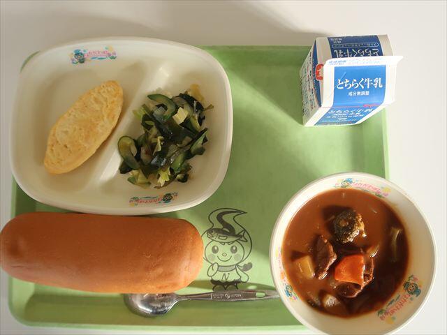今日は那珂川町産のとちぎ和牛を使った「ごちそうビーフシチュー」です。今年もJAなす南和牛部会より提供していただきました。たっぷりの牛肉と大きめにカットした野菜をじっくり煮込んだシチューです。