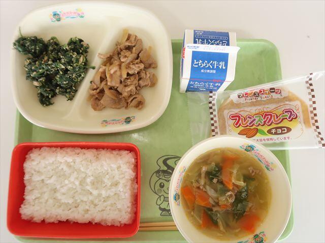 那珂川町の給食では、野菜はほうれん草だけですが、白菜やキャベツ、もやし、にんじんなどを入れたのり酢和えもあります。